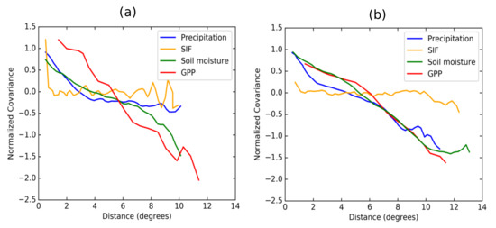 Covariogram of SIF, precipitation, soil moisture, and GPP data over (a) the Great Plains and (b) Texas.