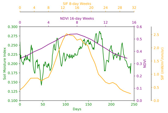 Lead–lag relationship between SIF and plant water need based on soil moisture index calculated from ESA soil moisture data. Soil moisture index is calculated as , where is soil moisture value at any given day of the growing season, and are the highest and lowest soil moisture values during the growing season, respectively. The soil moisture index and SIF values are averaged over the study period of 2007–2012. Day 0 corresponds to April 1st, which is considered the beginning of the growing season. SIF, soil moisture and NDVI values are estimated from grids of size 0.5 × 0.5°, 0.25 × 0.25° and 1 × 1 km, respectively, surrounding US-Ne3 FLUXNET station (41.1797 °N, –96.4396 °E). US-Ne3 station has rotated crop assignments: soybean at even years and corn at odd years [90].