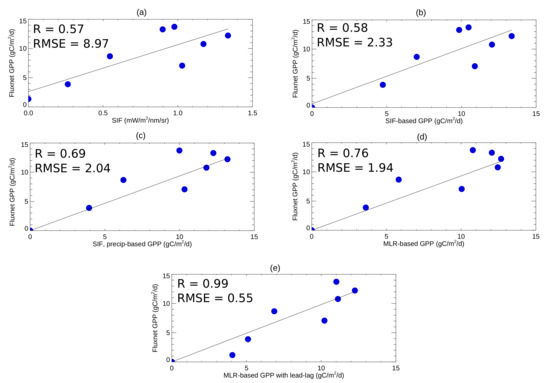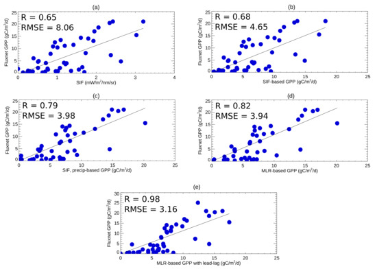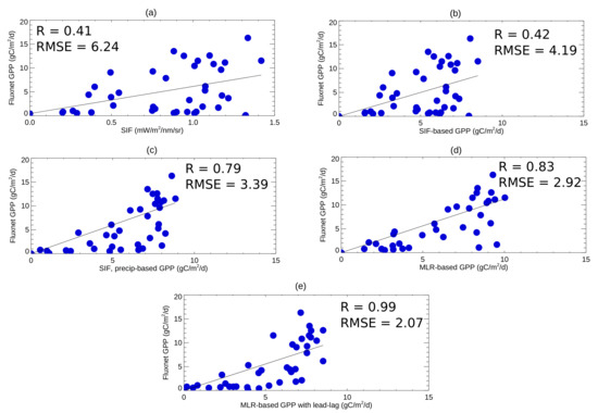 Relationship of mean monthly GPP (gC/m/day) measured at US-Twt FLUXNET station with rice as a characteristic plant species (Table 1) and (a) GOME-2 SIF; (b) SIF-based GPP; (c) SIF- and precipitation-based GPP; (d) MLR-based GPP (SIF, precipitation, soil moisture as predictors); (e) MLR-based GPP with lead–lag. The Spearman’s correlation coefficient R and root-mean-square error (gC/m/day) are shown.