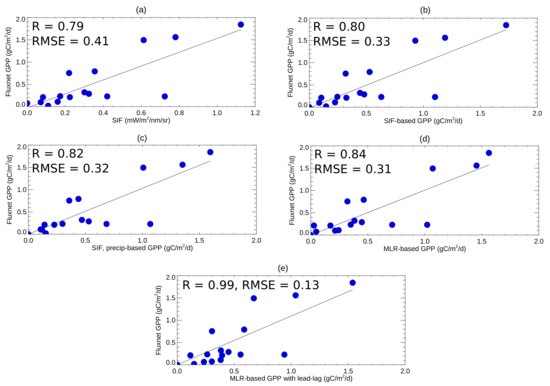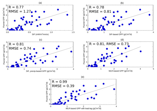 Relationship of mean monthly GPP (gC/m/day) measured at FLUXNET stations with C4 grass vegetation (Table 1) used in this study and (a) GOME-2 SIF; (b) SIF-based GPP; (c) SIF- and precipitation-based GPP; (d) MLR-based GPP (SIF, precipitation, soil moisture as predictors); (e) MLR-based GPP with lead–lag. The Spearman’s correlation coefficient R and root-mean-square error (gC/m/day) are shown.