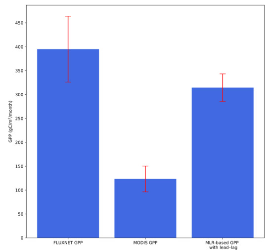 It is apparent from our findings that knowledge of plant lifecycle, lead–lag relationships, and the sensitivity of different plants to various environmental parameters is crucial for the purpose of plant production quantification. In order to provide more support for the proposed framework aimed at better MLR GPP estimation, we have calculated mean values and errors for the predicted GPP (MLR equation with lead–lag), and the reference datasets, MOD17A2 and FLUXNET GPP, within the CLM grid box surrounding US-ARM, US-AR1 and US-AR2 stations. Figure 10 shows that our mean monthly (for JJA of all the years) total (grass and crops combined) GPP within the grid box (315 gC/m/month) is consistent with FLUXNET stations’ observations (394 gC/m/month). Although MODIS captures the drought trend, the observed values of GPP within the grid box surrounding the stations are only 123 gC/m/month. This shows that our predicted, i.e., MLR-based with lead–lag, GPP estimates are the closest to the actual plant production, as inferred from FLUXNET flux tower observations.