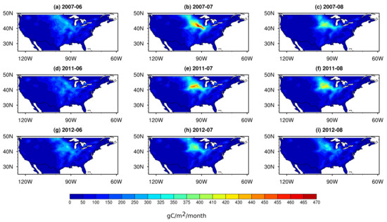 Gross primary production (gC/m/month) from BESS data product in summer 2007 (a–c), summer 2011 (d–f), and summer 2012 (g–i).