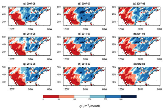Figure 14 indicates that BESS GPP values are typically lower than MLR GPP presented in this study and are slightly higher than MODIS GPP, which is likely related to the fact that the BESS algorithm considers the differences in C3/C4 photosynthetic pathways, while MODIS algorithm uses the same LUE across all vegetation types [92]. BESS is also capable of capturing the drought propagation in water stress years. It can be noted that in 2011 Texas experienced a significant decrease in GPP (below 100 gC/m/month), which is also noticeable in 2012. GPP over the Great Plains in 2012 demonstrated a decrease, which is especially pronounced in July–August 2012 as compared to 2007 and 2011 (Figure 14h,i).