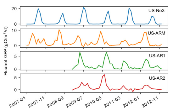 We linked GPP from FLUXNET measurements at five crop (US-Ne3, US-ARM, US-Twt, US-Tw2, US-Tw3) and five grass stations (US-KFS, US-AR1, US-AR2, US-Cop, US-Wkg) (Table 1) to SIF, precipitation and soil moisture. FLUXNET data have been extensively used in various studies investigating processes related to the exchange of CO between the land surface and atmosphere [55,56,57,58,59]. It was previously demonstrated that ecosystem-level GPP can be accurately estimated from measurements of CO fluxes at eddy covariance towers [60]. FLUXNET GPP values, which are calculated as difference between total ecosystem respiration and net ecosystem exchange, are obtained at a half-hourly step and expressed in µmol/m/s; therefore, we have converted GPP measurements to gC/m/day and gC/m/month, the units used throughout this study.
