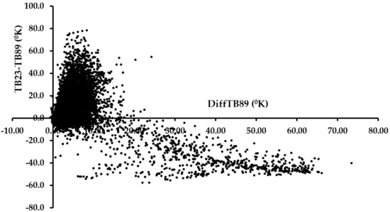 Inspection of the brightness temperature variations in the matched dataset revealed that GMI spectral signature of cases close to the coast had a distinct pattern characteristic of water surfaces: a large brightness temperature difference between vertical and horizontal polarization at the window channels and an increasing brightness temperature with increasing frequency. Figure 1 displays the scatter plot between the difference in the brightness temperature at 23 GHz and 89 GHz (vertical polarization, denoted as “TB23-TB89”) and the difference in vertical and horizontal brightness temperature at 89 GHz (denoted as DiffTB89). Negative values for the spectral gradient TB23-TB89 are associated with large positive values in DiffTB89. The map of diffTB89 over the continental US (not shown) confirmed that the largest values occur mostly over coastal areas. The same pattern holds for the polarization difference at 166 GHz. Most of the coastal matchup cases were filtered out by empirically using simple threshold values: a minimum of −20.0 for TB23-TB29 and a maximum of 20.0 for diffTB89.