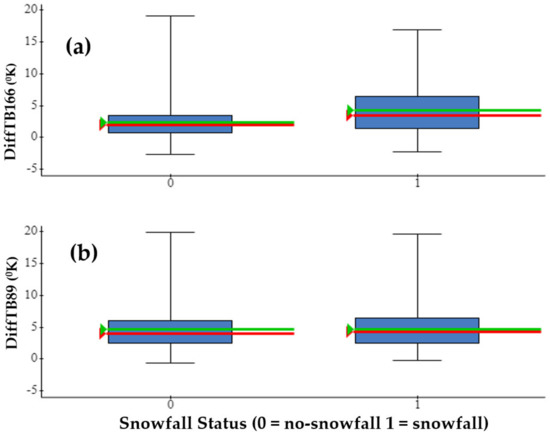 Boxplot of summary statistics—minimum, 25th percentile, median, mean, 75th percentile and maximum—for GMI vertical and horizontal polarization brightness temperature difference at (a) 166 GHz (DiffTB166) and (b) 89 GHz (DiffTBTB89) for the snowfall and no-snowfall sample. The green line indicates the mean value and the red line indicates the median value.