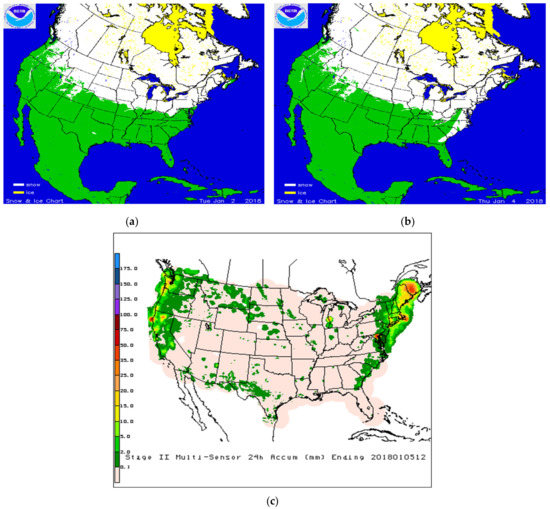IMS snow maps on (a) 2 January and (b) 4 January 2018, respectively, and (c) NCEP Stage IV Multi-Sensor 24 h precipitation accumulation ending 5 January 2018 12 Zulu time.