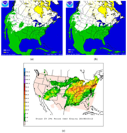 IMS snow maps on (a) 30 December 2018 and (b) 1 January 2019, respectively, and (c) NCEP Stage IV Multi-Sensor 24 h precipitation accumulation ending 1 January 2019 12 Zulu time.