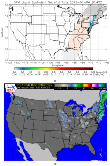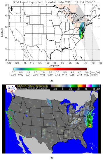 (a) Retrieved GMI-based Liquid Water Snowfall Rate in mm hr−1 (top) on 4 January 2018 20:45 Zulu time and (b) neat coincident NEXRAD base reflectivity in dbZ.