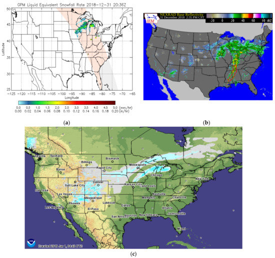 The imagery data were used to qualitatively assess the utility of GMI-based retrieval of snowfall. Next Generation Radar (NEXRAD) mosaic imagery of base reflectivity [18] was used to track close-in-time storm movement and inter-compare it with GMI snowfall retrieval maps. Since base reflectivity measurements do not estimate precipitation type (rain versus snowfall), they were combined with information about snow on the ground obtained from NOAA’s Integrated Multisensor Snow and Ice Mapping System (IMS; [19]) and forecast frozen precipitation obtained from an operational snow data assimilation system called SNODAS, generated at NOAA’s National Operational Hydrologic Remote Sensing Center ([20]; https://www.nohrsc.noaa.gov/nsa/). In addition, STAGE IV radar and gauge combined precipitation data produced at NOAA’s National Centers for Environmental Prediction (NCEP) were also utilized for visual assessment of accumulated precipitation [21].