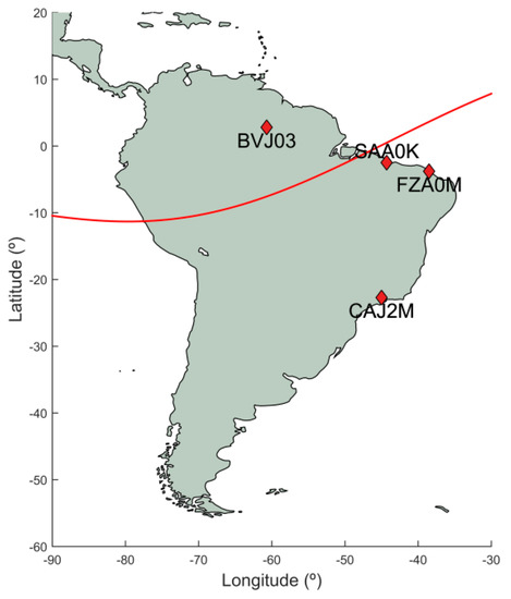Data from four ionosondes (digisondes from Lowell Digisonde International) (Figure 1) of the Brazilian National Institute for Space Research (INPE, acronym in Portuguese) were used: BVJ03 located in Boa Vista-RR (2.8N, 60.7W; 12.9N magnetic latitude), SAA0K in São Luiz-MA (2.5S, 44.3W; 0.8S magnetic latitude), FZA0M in Fortaleza-CE (3.8S, 38.5W; 5.5S magnetic latitude) and CAJ2M in Cachoeira Paulista-SP (22.7S, 45.0W; 16.4S magnetic latitude). Ionosonde data are available at the Space Weather Data Share, of Brazilian Study and Monitoring of Space Weather (EMBRACE/INPE) program [28]. In this study, only manually scaled foF2 data were used with a 10-min time resolution.