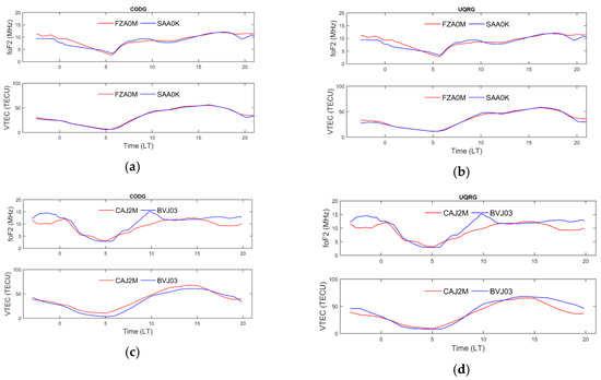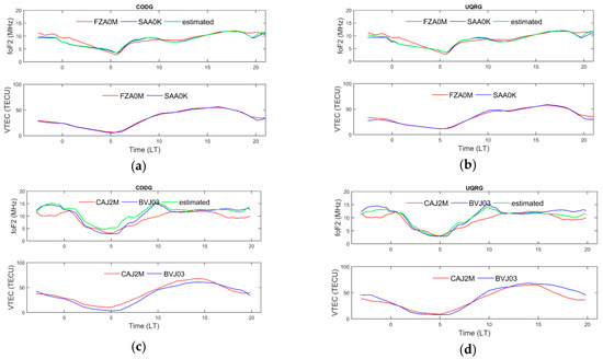 Comparison of the foF2 measured with ionosondes and VTEC values estimated for the respective ionosondes using CODG (a,c) and UQRG (b,d).