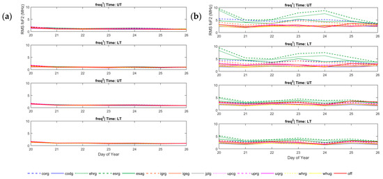 One-week RMS values of the differences between foF2 values estimated with the help of the different GIMs to describe the foF2 variation between the values measured at the pair of ionosondes, considering the four approaches described for two pairs of ionosondes: (a) FZA0M and SAA0K, the smallest distance; and (b) CAJ2M and BVJ03, the longest distance.