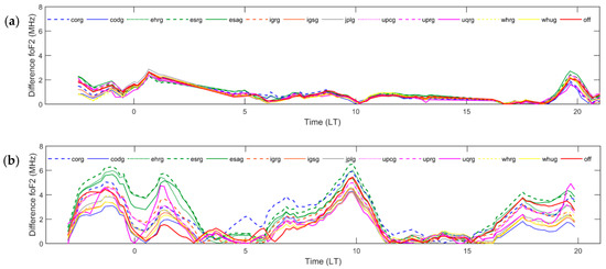 Differences between foF2 values measured at the ionosondes and estimated using GIMs, for two pairs of ionosondes: (a) FZA0M and SAA0K, the closest one; (b) CAJ2M and BVJ03, the most distant one.