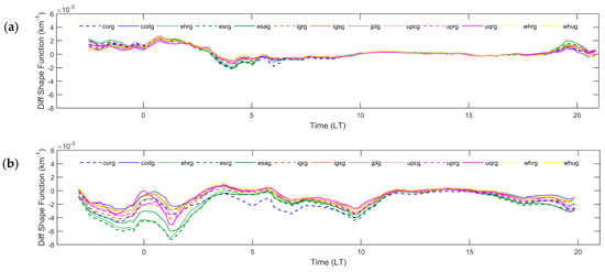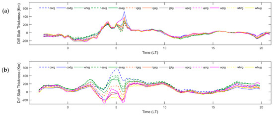 Figure 6 presents the differences between the estimated and measured foF2 for one day of the same two pairs considered before (with the smallest (a) and largest (b) distances). For these same data, we also present the difference in slab thickness (Figure 7) and the shape function peak (Figure 8). The results obtained in the estimation of foF2 are correlated to the behavior of the ionosphere reflected by slab thickness and shape function peak. The shape function peak demonstrated to be a good indicator to characterize the ionospheric similarity between two regions. Values presented in Figure 8a are much more similar than those from the most distant pair (Figure 8b). Considering the values for the first pair, the highest variability of the RMS (Figure 6a) occurs close to 0 h, 05 h, and 20 h LT, when similar periods with larger differences were observed in the shape function peak estimation. The higher differences between FAZ0M and SAA0K are associated with the geomagnetic locations and the effects of the equatorial ionization anomaly (EIA). SAA0K is located closer to the magnetic equator, which leads to lower ionization in comparison to FAZ0M (closer to the EIA crest). The peak of difference after 18 LT in Figure 6a is associated with the post-sunset enhancement of ionization, where EIA becomes more evident due to the transition between nighttime and daytime [12]. In the case of CAJ2M and BVJ03 (Figure 6b), they are located at a distinct magnetic hemisphere, with a large distance apart from them, and several reasons justify large foF2 differences, such as the EIA asymmetries, recombination rates, solar zenith angle, geomagnetic field configurations, and seasonal variabilities.