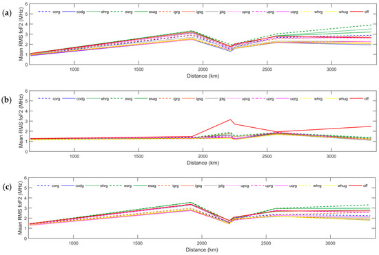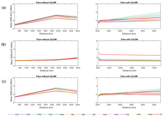 Mean RMS of the differences between foF2 values measured at the ionosondes and estimated using GIMs versus the distance of the ionosondes pairs considering one-week data: (a) test week (020-026/2015); (b) low (166-172/2015); (c) high (288-294/2015) ionospheric electron content.