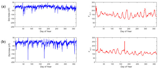 Figure 11 presents Dst (left) and F10.7 (right) indices for the years 2014 (a), 2015 (b), 2016 (c), and 2017 (d). Dst indices indicate the occurrence of some storms, including strong ones in the four years (−100 nT to −200 nT) and two severe storms in 2015 (−200 nT to −350 nT) [33]. F10.7 indicates active sun, in addition, it can be noticed the decrease of the solar activity from 2014 (solar cycle peak) to 2017.