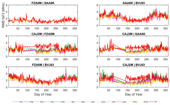 Figure 12 shows the RMS of foF2 differences for 2015 considering the thirteen GIMs and the six ionosonde pairs. Considering the general results, the seasonal influence can be noticed for all the pairs, with higher values from October to March, a period with higher ionospheric electron content in the Southern Hemisphere. In addition, the three pairs with ionosonde CAJ2M presented a higher improvement with the use of GIMs from March to October. It is worth highlighting that CAJ2M is the ionosonde with larger distances in latitude compared to the others, so the behavior of the ionosphere is less similar in this region. The results indicated that for the period with less intense ionospheric electron content, the use of GIMs led to significant improvement in the representation of the different regions considered, confirming the behavior observed in Figure 10b. That indicates this scenario like the one where the use of the GIMs presented the strongest improvements. On the other hand, when a period with higher ionospheric electron content is considered, the error estimated with the help of the GIMs is closer to the simple difference between the values of the ionosondes. These results indicate that besides being a challenging region, when periods with lower ionospheric electron content are considered, GIMs can be able to represent the Brazilian ionospheric variability. However, when periods with higher electron content are considered, the performance of GIMs representing the ionosphere in this region may not be so realistic. The worse performance of GIMs in this period can also be related to the increase of the ionospheric gradients that affect foF2 (local measurement) in a different way than VTEC (integrated measurements). The different influence in the foF2 and VTEC can be provided by the slab thickness, that in the case of the presented method is assumed to be constant. In this way, a worse performance of the method was expected, when regions and periods with different ionospheric gradients are considered. More details on the influence of slab thickness in the relations between foF2 and VTEC can be found in Spalla and Ciraolo [19], Leitinger et al. [20], and Kouris et al. [21]. Regarding the general performance of GIMs, it is worth mentioning the consistency of most of the products, presenting similar behavior, mainly if only the final products are considered, similar to other GIM assessment techniques [2].