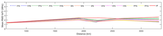 In Figure 13, we present the mean RMS from 2015 for each product versus distance. The results show an expected increase in the mean error related to the distance of the ionosonde and that even the products with a worse performance presented improvements in the estimation of critical frequency, compared with the approach without GIM information. These results confirm what was previously indicated with one-week data, and show that, on average, the results with GIM data presented a better performance than the simple differences between the measured values.