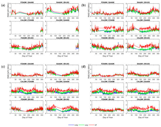 RMS values of the differences between foF2 values estimated with two GIMs products (CODG and UQRG) and measured at the ionosondes for the six pairs of ionosondes for one-year data: (a) 2014; (b) 2015; (c) 2016; (d) 2017.