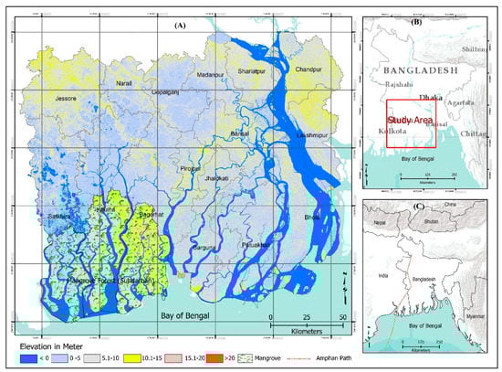 Figure 2). It is surrounded by the urban agglomeration around Dhaka to the north, the Bay of Bengal to the south, Chittagong to the east, and India to the west. Moreover, the Sundarban mangrove forests are located in the delta in the far south western portion of the area under study. The area consists of the active floodplains of the Ganges River and tidal floodplain as well as part of the Lower Meghna River [