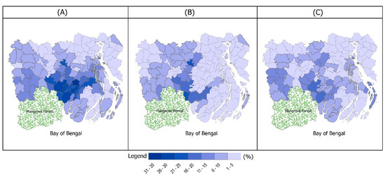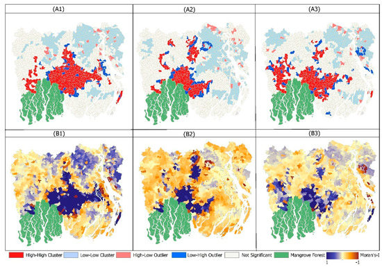 Figure 7(B1–B3)); the global mean values of local Moran’s-I statistic decreased from 0.46 to 0.17. This result indicates a general decrease in spatial clustering of flooding in the second week after cyclone Amphan. In the immediate aftereffects of Amphan, 188 Unions had high Moran’s-I values with a statistically significant