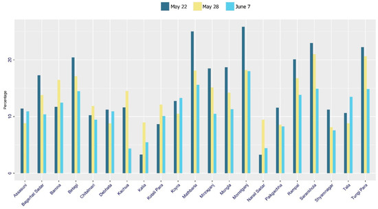 2, respectively. In terms of percentage of land inundated by floodwater for each district, Jhalokati, with the smallest area of the districts surveyed, had nearly 19% of its area inundated by floods on 22 May, while Pirojpur and Bagerhat were flooded 17% and 12% by area, respectively. Barisal and Satkhira were inundated over 7% by area. Jessore and Barguna were each inundated 6% by area.