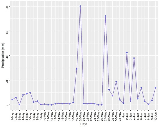 Figure 8) show that the average rainfall received in the study area was approximately 40 mm between 2 June and 5 June. Moreover, riverbank failure along with coastal polders and dikes were reported to have broken out due to increased volumes of surface runoff in south western regions of the area that was eventually resulting in incessant flooding [