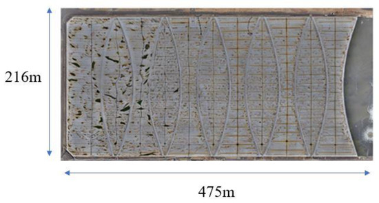 The first treatment lagoons are covered by high-density polyethylene (HDPE) sheets which are seam-welded together [1] to capture all odorous and greenhouse gases (e.g., hydrogen sulfide, methane) produced by the bacteria in the sewage under the covers. These HDPE covers are also known as floating covers since they are fixed to a concrete structure around the perimeter of the lagoons and the surface of the cover rises and falls (i.e., floats) with the changing depth of sewage. A satellite photo of a floating cover at the WTP is shown in Figure 1. Each of the HDPE covers is approximately 475 m long by 216 m wide by 2 mm thick and can collect up to 65,000 cubic meters of biogas per day, which can produce 7 MW of renewable energy [2]. This is more than enough power to sustain the daily operation of WTP and surplus electricity is exported from the site to the grid.
