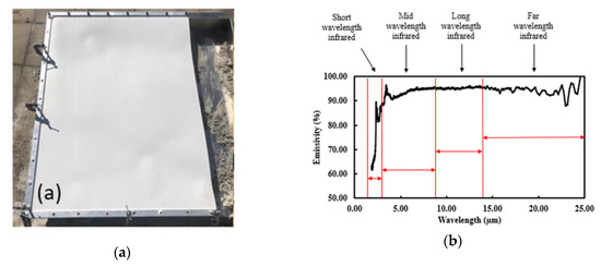 (a) a high-density polyethylene (HDPE) geomembrane specimen was clamped on the aluminum container; (b) emissivity spectrum of the HDPE membrane from Fourier-transform infrared (FTIR) spectroscopy.