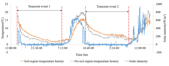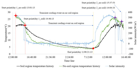 It is noted that on the first day, the temperature of the HDPE region that is not in contact with the clayey soil started to decrease at 13:01:13, see Figure 6. Similar results were also measured on the second day (after 14:04:33). These points mark the starting point of the commencement of the transient cooling event.