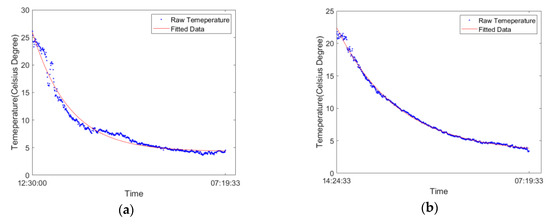 (a) curve fitting of the temperature decay curve of the no-soil region on the geomembrane and (b) curve fitting of the temperature decay curve of the soil region on the geomembrane.
