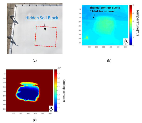 To demonstrate the advantage of this proposed technique, the cooling constant over the entire HDPE sheet is calculated using one transient cooling event. For comparison purposes, the optical image taken of the HDPE material with soil underneath is plotted together with the thermal image at one instant and the resultant cooling constant mapping in Figure 8a–c, respectively. Figure 8a was taken using an optical camera and shows the location of the hidden soil (underneath the cover). Figure 8b shows the raw thermal image taken at an instant (single frame) by the thermal camera during the transient event, a thermal contrast can be seen on the thermal image, however, the difference in temperature between the soil region and no-soil region is small (approximately 4 °C at this instant). As shown in Figure 6, the temperature contrast between the regions with and without the soil changes with the time in a day. The thermal contrast also depends heavily on which frame was chosen for analysis. Moreover, the condition of the cover (i.e., dirt, fold line and view angle) can also affect the accuracy of the temperature measurement.