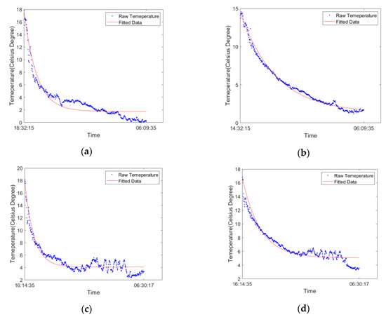 Newton’s law of cooling is used to define the rate of cooling during the thermal transient. The temperature histories during the transient cooling events for both selected points were fitted with Equation (2) using the curving fitting tool in MATLAB. It is noted here in the experiment, the ambient temperature varied with time. While in the curve fitting, the value of was set as the final temperature of the transient event (4.3 °C) and kept as a constant value over the whole event. This is because the cooling constant is proportional to the temperature difference between the ambient conditions and the geomembrane. Varied ambient temperature will make the cooling constant change over time, and the cooling constant will not be consistent in the curve fitting if the ambient temperature changes. Therefore, the curve fitting with Newton’s cooling law in this paper assumed that the geomembrane is cooling in a constant ambient temperature and the resultant efficient cooling constant k can be consistent over the whole event. Given that the temperature of geomembrane changes quite slowly at the end of the event, it was assumed that the geomembrane achieves ambient temperature at this point, and the ambient temperature was set as the value at this point.