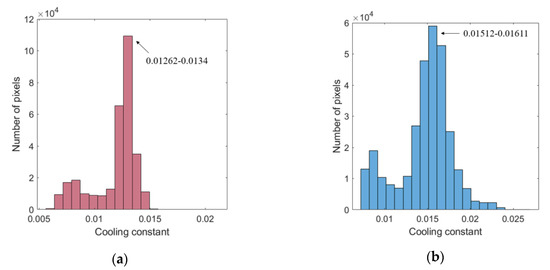 Cooling constant distribution in cooling constant maps of the two days experiment. (a) day 1. (b) day 2.