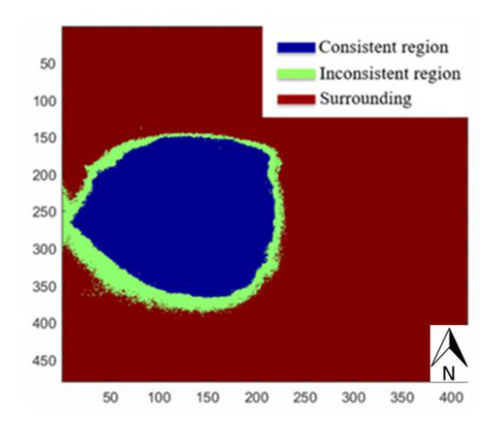 The maps of cooling constants of the membrane over two days were plotted and are shown in Figure 11. The resolution of the image in this experiment is 480 by 420 pixels (i.e., 201,600 pixels). To validate the measurement consistency, a normalization study was conducted to make the threshold of defining the with-soil region the same in two days experiment. The histograms of values of cooling constant are shown in Figure 12 and it can be observed that the values approximate the normal distribution. The cooling constant plot shown in Figure 12 is scaled with respect to the peak value shown in Figure 12. The cooling constants maps in Figure 11 were divided by the background spans (0.01262 in day one, 0.01512 in day two) and the normalized maps are plotted in Figure 13. The upper limit of the threshold is set as 1 given that the cooling constant at the region over the soil region is always lower than the background. It can be observed that the normalized cooling constant of the soil region is roughly lower than 0.65. A statistical study of the threshold to determine the region of soil in the cooling constant map was conducted with a 0.05 step change in the up limits of normalized cooling constant. Table 5 shows the comparison of the area of soil region in two days experiment. 2.94% mean difference indicates that the quasi-active thermography in two days experiment has a good measurement consistency. This indicates that although cooling constant values change in different transient events, the ksoil and kno-soil will change proportionally, and the results are consistent after normalization. For comparison, the mean soil region areas from the statistical analysis were extracted in MATLAB code and the contrast in Figure 14 shows the difference of measurement. Nevertheless, in each measurement, the proportional contrast in cooling constant between the cover with and no-soil beneath the cover material can still be differentiated easily and can be used to define and outline the profile of the soil in contact with the cover. This experiment again provides evidence of the consistency of quasi-active thermography measurements with different ambient temperature profiles and lengths of transient events.