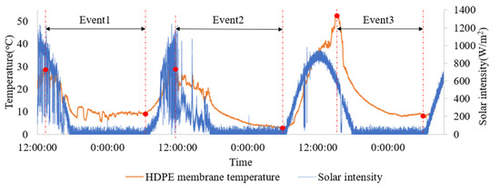 One transient cooling event is expected to commence during the experiment in the afternoon. Since the location of the under-surface soil is known, two points on the HDPE geomembrane were chosen for comparison, one was selected at the point where the geomembrane is in contact with the block of clayey soil, and another point was selected at a point away from where the simulated scum under the geomembrane. The temperature information at both points was extracted from all the obtained thermal images (during the experiment) and plotted in Figure 6. Different points on the same region will have slightly different temperatures, but this will not affect the whole cooling process. The solar intensity data obtained from the pyranometer is also shown in this figure. The reduction in the solar intensity shown in the figure is recorded as the afternoon progresses. As hypothesized, the thermal response at the regions of the HDPE that is in contact with the soil and those that are not are markedly different.