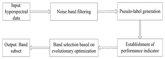 In this paper, an unsupervised band selection problem is first transformed into a supervised band selection one by generating pseudo-labels. Figure 3 shows the framework of the proposed algorithm. Firstly, for the input original hyperspectral data, the noise filtering strategy based on grid division is used to delete irrelevant/noise bands. Secondly, the hypergraph evolutionary clustering method with less computational cost is introduced to classify similar pixels into the same category, and label all pixels. On the basis of these pseudo labels, the classification accuracy of a band subset can be calculated. Taking the classification accuracy as the objective function or performance indicator, finally, an evolutionary algorithm is used to optimize the function to find optimal band subset.