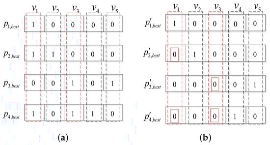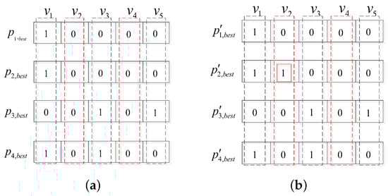 Taking the case of 4 populations as the example, Figure 8 illustrates the process of dealing with isolated vertices. Figure 8a shows the hypergraph obtained by the 4 populations after iterations, namely, . We can see that the second and fourth vertices are not selected by any hypergraph (their corresponding values are all 0), so they are isolated vertices. Supposing that the hyperedge weight of achieves the most improvement when adding the isolated vertex , then is only inserted into , that is, . However, the weights of all hyperedges are not improved by adding , so we do not do anything about it.