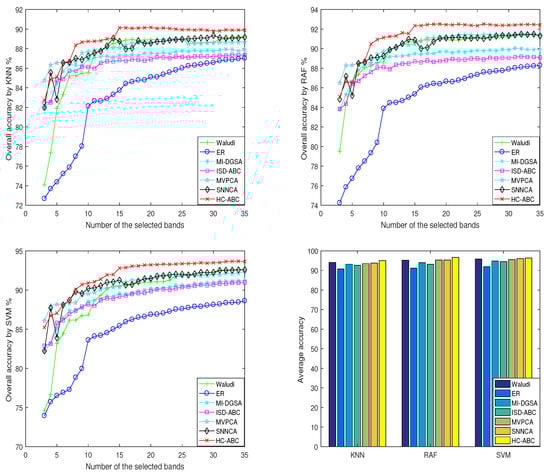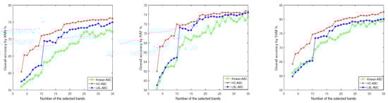 For the Pavia University, it can be seen from Figure 16 that: (1) When the number of selected bands is low, the OA value of HC-ABC is slightly smaller than that of LBL-ABC; however, when the number of selected bands is greater than 30, the OA values of HC-ABC on the three classifiers are about 4% higher than those of LBL-ABC and K-mean-ABC. In addition, when the number of selected bands is between , for the classifiers KNN and SVM, the OA values of HC-ABC are about 1% higher than that of LBL-ABC, and about 2% higher than that of K-mean-ABC; for the classifier RAF, HC-ABC, and LBL-ABC get similar OA values, and their values are about 2% higher than that of K-mean-ABC.