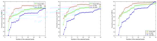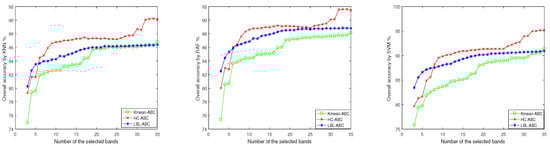 For convenience, the HC-ABC using K-mean clustering called K-mean-ABC, and the HC-ABC using layer-by-layer clustering called LBL-ABC. Figure 15, Figure 16 and Figure 17 show the OA values of band subsets obtained by the three algorithms with the three classifiers.