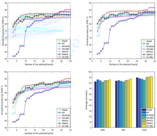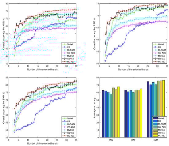 For the Indian Pines, it can be seen from Figure 18 that HC-ABC achieved better OA and AA values when using 3 classifiers. Specifically: (1) For the classifier KNN, when the number of selected bands is between 3–9, the OA values of HC-ABC are slightly lower than that SNNCA, but significantly higher than that of the other 5 comparison algorithms; with the increase of the number of selected bands, the OA values of HC-ABC are significantly higher than that of all the comparison algorithms. (2) For the classifiers RAF and SVM, HC-ABC, and SNNCA have similar OA values, which are significantly better than the other 5 comparison algorithms; when the number of selected bands is 17–30, the OA values of HC-ABC are significantly better than that of SNNCA. (3) When using the classifiers KNN and RAF, the AA values of HC-ABC are significantly higher than that of the six comparison algorithms; when using the classifier SVM, HC-ABC and Waludi achieved similar AA values. Th reason may be that the band subset of 30 bands is not the best result of HC-ABC.