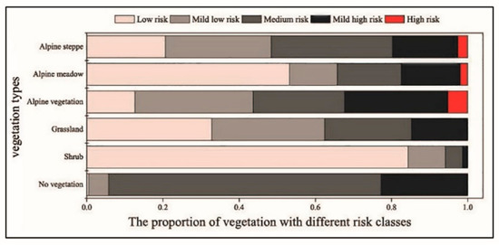 At site scale, alpine steppe has the largest disturbance index of vegetation and bare land patches of the four grassland types in the SRYR, followed by degraded meadows and alpine meadow, and the smallest is swamp meadow (Table 6). The ecological risk indices of swamp meadow, alpine meadow, degraded meadow, and alpine steppe are 107.521, 135.972, 200.102, and 249.144, respectively (Table 6). At regional scale, the ecological risk statuses of different vegetation types in the SRYR are quite different (Figure 11). Among the different types of vegetation, only alpine steppe, alpine meadows, and alpine vegetation have high-risk area proportions. Alpine vegetation and no vegetation areas have the highest proportion of mild high risks, followed by alpine meadow, alpine steppe, and grassland. The risk proportion was the largest in the no vegetation area and the smallest in the shrub area. The mild low risk areas of alpine steppe, alpine vegetation, and grassland account for a large proportion, followed by alpine meadow and non-vegetated areas. Shrubs have the highest proportion of low risk, followed by alpine meadow, grassland, alpine steppe, alpine vegetation, and no vegetation areas.