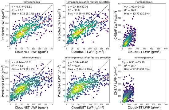 Scatter plot for homogeneous (upper) and inhomogeneous (lower) situations with no feature selection (left column), with feature selection (middle column), and CM SAF LWP (right column) for Leipzig. Independent test data shown in this figure are a random subset of 33% of the full dataset, and date from 11 August 2011 to 30 November 2015. The red solid line is a line of best fit to the scatter plot, and the black dotted line is an identity line. The color indicates the point density from blue (low) to yellow (high), estimated by a Gaussian kernel density estimation. Note that the axes for the CM SAF LWP plots have different sizes to include all data points.