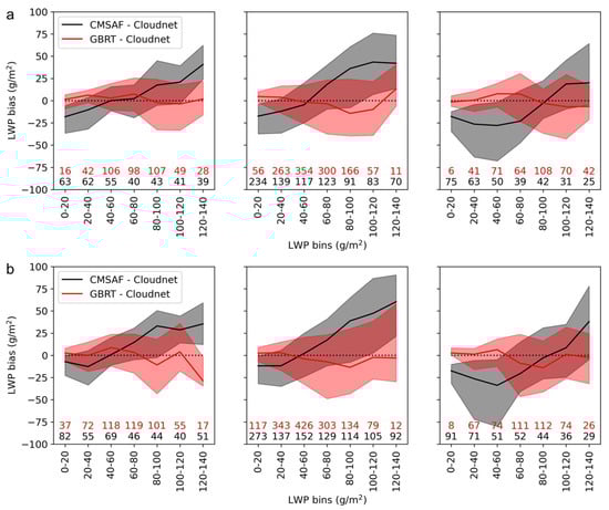 Median and interquartile range of biases between CloudNet LWP binned by LWP predicted by the GBRT model (red) and CM SAF (black) for: (a) homogeneous cloud fields; and (b) inhomogeneous ones without feature selection for Leipzig (left), Lindenberg (middle), and Juelich (right), respectively. Numbers at the bottom of the panels state number of observations.