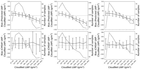 Bias calculated for bins of 20 g m−2 from instantaneous LWP retrieved by the GBRT model (top) and CLAAS-2 (bottom) as a function of CloudNet LWP for Leipzig (left), Lindenberg (middle), and Juelich (right) for homogeneous cloud fields without feature selection. The error bars are for one standard deviation of samples in each bin. The dotted line indicates the number of samples.