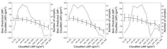 Bias calculated for bins of 20 g m−2 from daily medians of LWP retrieved by the GBRT model as a function of CloudNet LWP for Leipzig (left), Lindenberg (middle), and Juelich (right) for homogeneous cloud fields without feature selection. The error bars are for one standard deviation of samples in each bin. The dotted line indicates the number of samples.