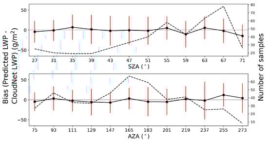 Angle-dependent error plots as a function of solar zenith angle (top) and azimuth angle (bottom) for test data for homogeneous without feature selection in Leipzig. The black lines are means of the bias between LWP retrieved by the GBRT model and CloudNet LWP with one standard deviation as the red vertical line. The black dashed lines indicate the number of samples.