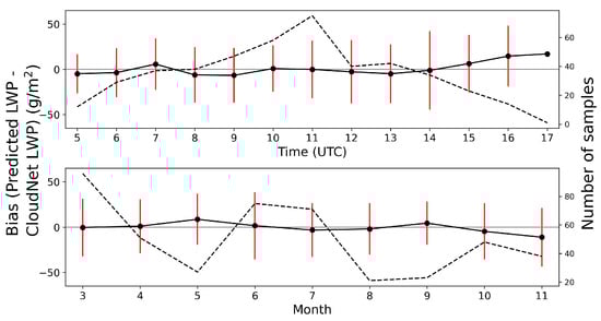 Time-dependent error plots as a function of hours (top) and months (bottom) for test data for homogeneous without feature selection in Leipzig. The black lines are means of the bias between LWP retrieved by the GBRT model and CloudNet LWP with one standard deviation as the red vertical line. The black dashed lines indicate the number of samples.