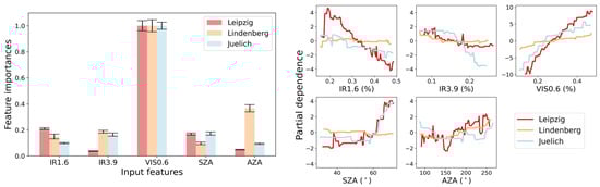 The model input variables and their influence on the model’s predictions are investigated for a better understanding of how the model works. Figure 7 and Figure 8 show the feature importances and the partial dependencies of the GBRT models for the three study sites for without feature selection (Feature Set 1) and with feature selection (Feature Set 2), respectively, for homogeneous cloud fields to get a more reliable analysis. The y-axis of the PD plot shows the relative contribution of the input feature on the prediction. Partial dependence is the average response of an estimator for each possible grid value of the feature (x-axis) based on a weighted tree traversal []. It can be interpreted as a relationship between two variables (i.e., input feature and target). For example, positive (negative) values indicate that a specific grid value is corresponding to an increase (decrease) of predicted LWP. The important features identified in the feature importance result on the upper (Figure 7) and the left (Figure 8) can be related to high/obvious partial dependence in the PD plots.